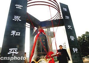 “和平大钟”在侵华日军南京大屠杀遇难同胞纪念馆安装成功,并将在12月13日举行的悼念侵华日军南京大屠杀30万遇难同胞66周年仪式暨南京国际和平日集会上首次撞响。