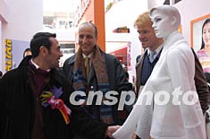 第二届中国(大朗)国际毛织产品交易会十三日在广东东莞大朗镇新落成的中国大朗毛织贸易中心开幕,来自日、德、意、港澳台及中国内地的三百多家企业到场参展交易。图为法国著名时装设计师前来交易会现场参观。作者:罗仰明