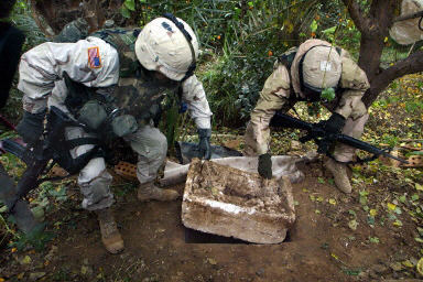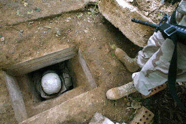 12月15日,在伊拉克提克里特附近,美军第四步兵师士兵展示萨达姆被捕时藏身的地洞。