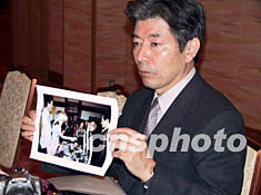 日本业余摄影师松田定明向中国记者展示二十五年前拍摄的邓小平出人意料出席日本新人婚礼的获奖图片《友好的瞬间》。该图片获得一九七八年《读卖新闻》年度大奖。作者:刘莉生