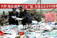 十六日,广州大铲海关在珠江口水域将今年以来没收的“三无”船42艘和一批淫秽光碟、淫秽书刊公开销毁。作者:朱晓丹