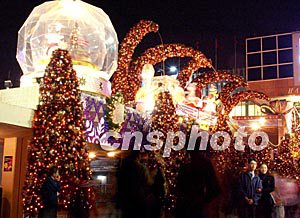 圣诞节前夕,香港尖沙咀东部各式各样的圣诞节灯饰璀璨夺目,吸引许多访港的内地旅客留影。作者:洪少葵