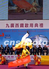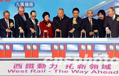 香港九广西铁12月20日正式通车,图为行政长官董建华、环境运输及工务局局长廖秀冬、九广铁路主席田北辰等嘉宾在锦上路站主持启用仪式。中新社记者:洪少葵