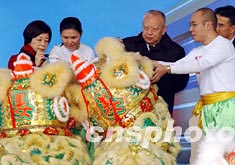 香港特区行政长官董建华、环境运输及工务局局长廖秀冬,12月20日在九广西铁启用典礼上主持启用仪式为醒狮点睛。中新社记者:洪少葵