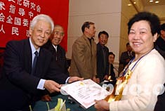 十二月二十二日,中国餐饮业最高奖项“伊尹奖”颁奖表彰大会在北京人民大会堂举行,全国政协副主席周铁农(左)等向刘宝等二十八名获奖者颁发了证书。中新社记者:武仲林