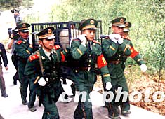 图为关在笼子里的大熊猫被武警抬进“新家”。