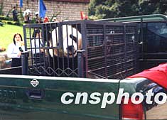 图为大熊猫恋恋不舍告别家乡——卧龙中国保护大熊猫研究中心,准备向“新家”行进。
