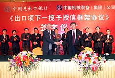 十二月二十二日,中国进出口银行与中国机械装备(集团)公司在北京签署了总额为15亿美元的出口项下一揽子授信框架协议,主要用于支持该公司在未来三年内的境外投资、对外承包工程及机电产品、高新技术产品出口等项目。图为中国进出口银行苏中副行长(前排左)和中国机械装备(集团)公司赵风茂(前排右)副总裁代表双方签署协议。中新社记者:张勤