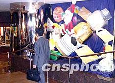 随着“神舟五号”载人飞船的成功返回,香港也曾掀起一股航空热。在商场圣诞装饰中,以圣诞老人乘飞船亦成为香港圣诞装饰一景。中新社记者:谭达明