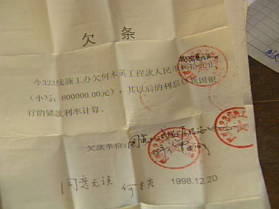 林景惠:“民工投劳力,还有一些小老板也代资。比如我们请下面的包工头,给我们完成工程的话,我们第二步就给股份。第二步就答应在一年内加银行利息,加倍的银行利息给他们。”据调查,自1999年底新股东进入后,合作三方股东打起了官司,一些包工头和民工代表为追回工钱,也将丙方告上了法庭,2001年,韶关中级人民法院执行了财产保全,冻结了收费站的1300万元收费款。林景惠:“有约定完工过后就付清所有我的工资部分,付清80%剩余的部分就在六个月之内全部付清。1996年6月份我就全部把工做完了,做完了就一直等钱,一直等到现在。”记者:“一年以后工程完工了,但是你们却没有能力来支付民工这笔钱?”林景惠:“没办法。说实话对民工这个欠款我是深表同情的,所以从1996年开始全部收入基本上来讲,就给这个工程队我们都有付的清单。”记者在收费站采访时,正碰到几个民工拿着判决书来讨工钱。在调查中记者发现,有些判决已生效3年多,但民工还是没有拿到工钱。记者:“这些钱全部就给了施工队,付给施工队,施工队总共欠了才一千多万。你这两千多万都给他了,那就应该说是早还清了,实际上你们欠了不止一千多万。”民工:“实际不止,所欠的款项应该是达到了三千万吧,两千多万、三千万左右。”