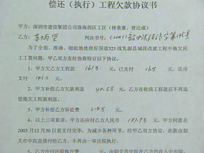 邹远贵:“我追了八年债,我没回过家。没办法回去,1997年我父亲去世了,我哭了10次。”据他们介绍,这条路是1994年3月上马的,当时乳源县政府以招商引资的方式引来广西梧州明兴房地产开发公司、深圳建设集团公司珠海西区工区,三方约定:工程总投资5800万元,由甲方乳源县政府以征地、拆迁等形式出资580万元,乙方广西梧州方出资1000万元,丙方深圳珠海工区自筹其余工程款4220万元,并以大包干的形式负责工程项目的全部施工建设。然而在实施过程中,资金却出现了问题。