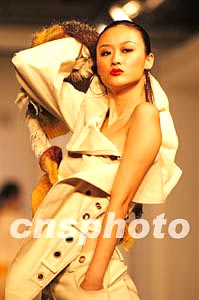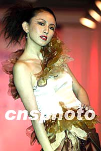 二十四日下午,在二零零三中国国际时装周获得大奖的几位广东著名服装设计师在广州举办汇报演出,展示获奖作品中的一款别致女装。作者:柯小军