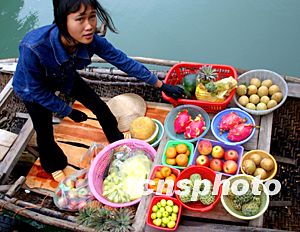 新年前越南下龙湾百姓在海面小船上向游客兜售水果。地处热带地区的越南冬季进入旅游高峰,每年元旦春节都有中国大批游客到越南旅游。中新社记者:宋吉河