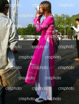 新年前,一位身着越南旗袍的中国姑娘在越南一旅游区拍照。这种被誉为越南国服的旗袍受到一些中国姑娘喜欢。宋吉河 摄