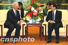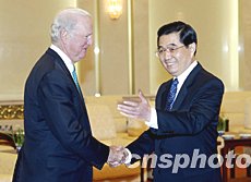 中新网12月29日电 据中国外交部消息,2003年12月29日下午,中国国家主席胡锦涛在人民大会堂会见了美国总统特使、前国务卿贝克。宾主进行了友好的谈话。