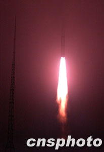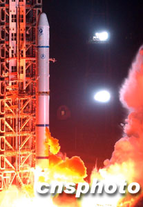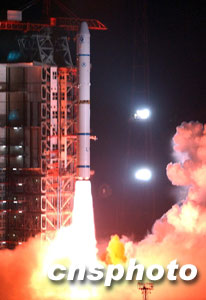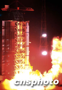 北京时间三十日凌晨三时许,中国“双星计划”的第一颗卫星“探测一号”在西昌卫星发射中心由“长征二号丙”改进型运载火箭发射升空。至此,二00三年中国六次航天发射全部告捷,也为中国航天年画上一个圆满的句号。本次卫星发射是中国运载火箭迄今为止最高的一次飞行,“探测一号”也因此成为中国目前轨道距地球最远的一颗卫星。 中新社记者 张炜 摄