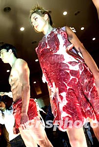 二十九日晚在北京举行的NE.TIGER时尚峰会上,模特展示一款别开生面的“牛肉装”,设计者将牛肉演化为天然面料,制成薄薄的长裙,使动物的物质本身创造性地体现了人的奇异视觉美感。中新社记者:毛建军