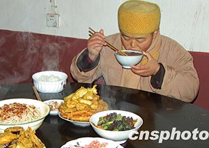 十二月三十日正是农历腊月初八,在中国民间自古有吃腊八粥庆贺五谷丰收的习俗。当日重庆市奉节县清静庵僧人,在做佛事并祈求新年幸福之后,在餐桌前享用腊八粥。作者:周会