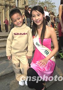 一位澳门小朋友在大三巴与一位佳丽合影。作者:李刚