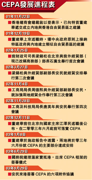 在二零零三年六月签署的CEPA包括货物贸易、服务贸易和贸易投资便利化三部分。其中,货物贸易部分规定,自二零零四年一月一日起,对输往内地的二百七十三种原产于香港的货物实行零关税。(戴庆成)