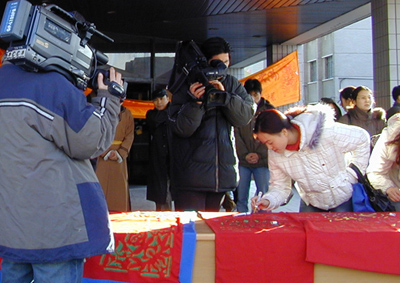 中新网1月2日电 正全力完成中国民间剪纸成为联合国教科文组织非物质文化遗产申报工作的中央美术学院非物质文化遗产研究中心,2004年元旦这天在北京大学举办了第二届“青年文化遗产日”活动,为支持剪纸艺术列入文化遗产,全国26所高校的学生代表,在北京大学举行支持中国剪纸申报文化遗产的签名活动。