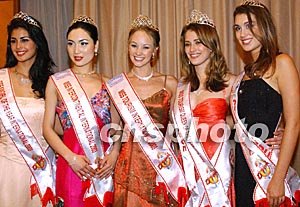 日前,在马来西亚首都吉隆坡举行的第八届国际旅游小姐选美总决赛上共评出五项冠军,大赛组委会主席向记者阐明,国际旅游小姐选美赛不同其它选美赛事,组委会现持有五项马来西亚旅游部授权的大赛执照,是次大赛由评判团评出的有五项冠军桂冠,南非的选手ANGELA BECK获国际旅游小姐冠军、希腊小姐获国际旅游年度皇后冠军、中国选手邢会原获世界洲际小姐冠军、阿根廷选手获梦幻小姐冠军、捷克选手获国际名城小姐冠军。而且经授权,国际旅游年度皇后和国际名城小姐两项赛事,已确定2004年分别在中国举行。曾于2001年参加该赛的中国佳丽阎巍获得梦幻小姐冠军,2002年中国佳丽殷子获得国际旅游年度皇后桂冠。图为大赛评选出的获得不同项目的五名冠军得主。中新社记者:钱兴强