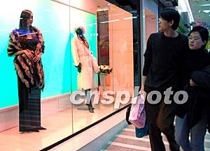 元旦过后春节将至,北京一些商家为了吸引了顾客周日在橱窗里上演真人模特秀。作者:张雷