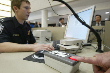 2004年1月5日,在洛杉矶国际机场,美国海关及边境安全部门的官员展示新的指纹识别及拍照系统。从5日起,美国全境将推广使用该系统,对进入美国的外国游客进行身份识别。