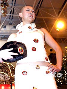 新春佳节即将来临,各种联谊活动不断推新,一位光头模特在联谊会上披挂毛主席像章上台表演。中新社记者:史利