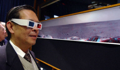 1月5日,在美国加利福尼亚州帕萨迪纳的宇航局喷气推进实验室,彼特博士配戴着立体眼镜观看“勇气”号火星探测器搭载的照相机拍摄的三维图像。