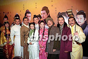 一月六日,由新加坡新动力传媒投资拍摄的古装神话剧《赤子成龙》在北京举行新闻发布会。中国内地当红演员任泉(左六)和李小璐(左五)担纲该剧男女一号,新加坡演员李铭顺(左四)、香港演员黄日华(右一)、恬妞(左一)等也加盟此剧共同演绎中国神话版的《罗密欧与朱丽叶》。作者:徐曦弋