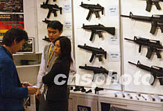 元月六日在香港会展中心开幕的“第三十届香港玩具展”上,玩具商展示的仿真枪吸引参观爱好者。中新社记者:钱兴强