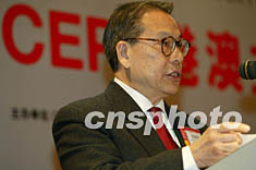 澳门特别行政区行政会委员、出入口商会会长吴荣恪一月七日在北京出席CEPA香港澳门(内地)推广周暨内地与港澳经贸合作发展研讨会。中新社记者:满会乔