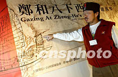 “台湾山河探险协会”理事长徐海鹏一月八日在北京举行的新闻发布会上介绍郑和下西洋航海路线图,并号召海峡两岸共同参与“郑和八下西洋”探险活动,以纪念明朝伟大航海家郑和六百年前下西洋的壮举。探险队在精心挑选队员后,将于2005年启航,历时三年走访二十余个国家、数十个港口,2008年返航。中新社记者:毛建军