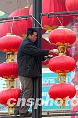 中国农历新年即将来临,一名工人正在北京街头安装大红灯笼。新春佳节临近,北京的新年气氛越来越浓。中新社记者:张炜