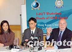 香港警方及国际刑警组织秘书处于元月十三日在港联合举办“国际刑警全球联络系统I-24/7”训练课程及工作坊开幕仪式,该系统为国际刑警各分局进行了技术革新,提供一个更加安全有效,并且更符合成本效益的通讯系统,以供亚洲地区中心局的警务人员参加。图为国际刑警组织秘书处负责有关联络系统的主管Stanley morris(右一)在仪式上向传媒介绍有关情况。作者:钱兴强
