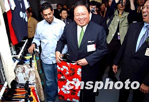 香港民政事务局局长何志平,1月13日在“香港时装节”上参观展场时兴高采烈。