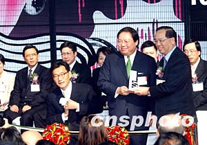 “香港时装节秋冬系列2004及香港国际时尚荟萃2004”,1月13日至16日在会展中心举行,图为香港民政事务局局长何志平[中]、贸发局成衣业咨询委员会主席郑维志及贸发局总裁施祖祥[右]主持展览开幕典礼。