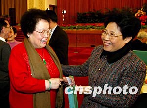 2004年侨界新春茶话会十四日在北京人民大会堂举行,国务院侨务办公室主任陈玉杰(右)与全国政协委员、香港富商陈丽华亲切交谈。中新社记者 毛建军 摄