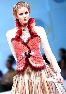香港1月15日举办“香港国际时装设计师表演”专场,图为模特展示来自加拿大时装设计师陈慧南的作品。中新社记者:洪少葵
