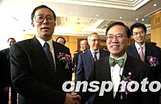 一月十五日,香港地铁有限公司投资深圳市轨道交通四号线原则性协议在深圳签署。该线南起皇岗口岸北至龙华新城中心,总长二十一公里,总投资约人民币六十亿元,计划二零零八年建成通车,建成后可与香港九广铁路落马洲支线实现接驳。图为香港政务司司长曾荫权和深圳市代市长李鸿忠出席签署仪式。作者:陈文