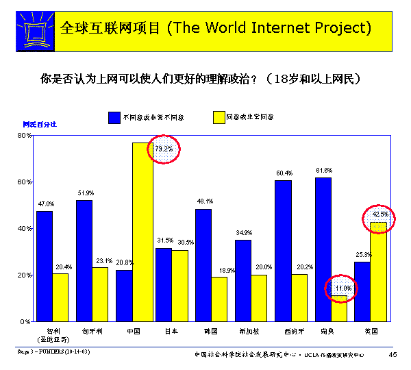 总的来说,多数国家的网民有一个共同的趋向:更多的人相信互联网能够帮助人们理解政治事件,而不是给与他们更多的政治权利。