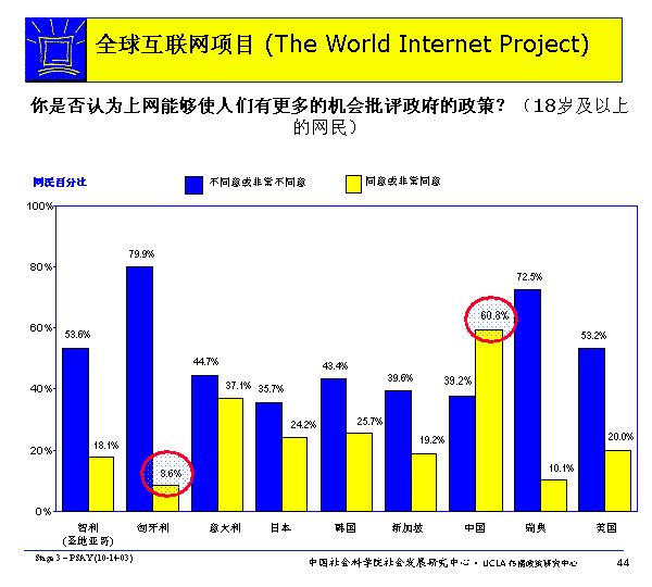 大多数人不相信互联网可以使人们有更多的机会批评政府的政策。只有8.6%的匈牙利人同意或非常同意上网可以使人们对政府工作有更多的发言权。而意大利的网民中有37.1%的同意或非常同意这一点。