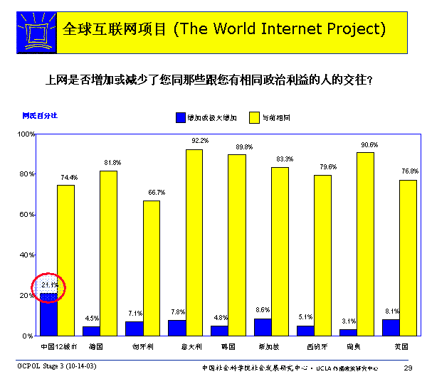 上网没有改变大多数网民同那些有相同政治利益的人的交往数量。然而,少数网民报告使用互联网增加了与这些人的交往;这类网民最多的是在中国,21.1%的网民报告他们增加或极大增加了同这类人的交往。