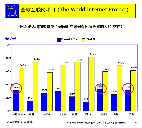 用网没有改变大多数网民同那些从事相同职业的人的交往数量。相当数量的网民报告他们用网增加了与这些人的交往;这类网民最多的是在西班牙,32.4%的网民报告他们增加或极大增加了同这类人的交往。