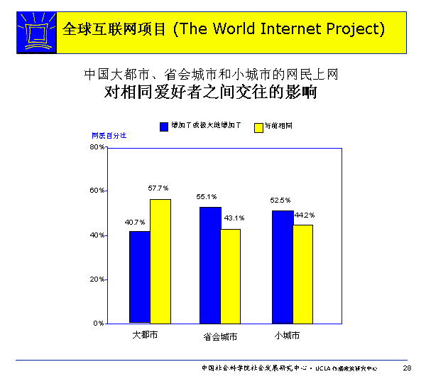 从中国的调查数据看,大都市网民认为上网增加了他们跟有相同业余爱好或相同娱乐活动的人的交往的人数要明显少于省会城市和小城市。