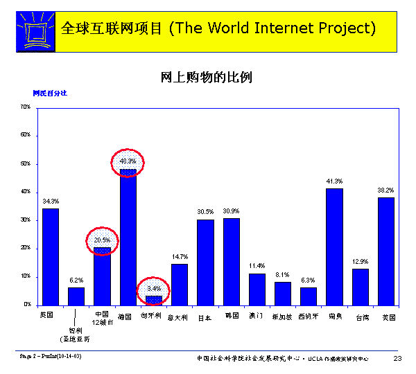 各国网民网上购物的比例各不相同,德国为最高(48.3%),匈牙利为最低(3.4%) 。当然,有网上购物经验不等于经常上网购物,也不等于在网上花很多钱购物。按照社科院社会发展研究中心的数据,中国网民上网购物的频次和网上购物支出的钱数都是相对比较低的。