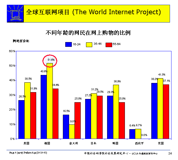 除意大利外,通常中年人更愿意在网上购物。所有国家35-44岁之间的网民比16-24岁或55-64岁之间的网民更可能上网购物。