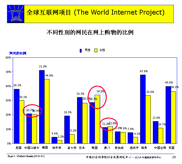 在除韩国和澳门以外的所有WIP国家里,男性比女性更可能网上购物。
