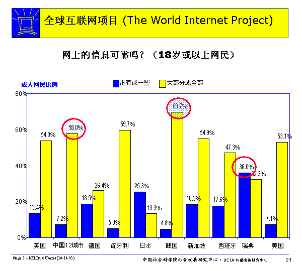 韩国网民最信任网上信息,69.7%的网民认为网上的大部分信息都是可靠的。